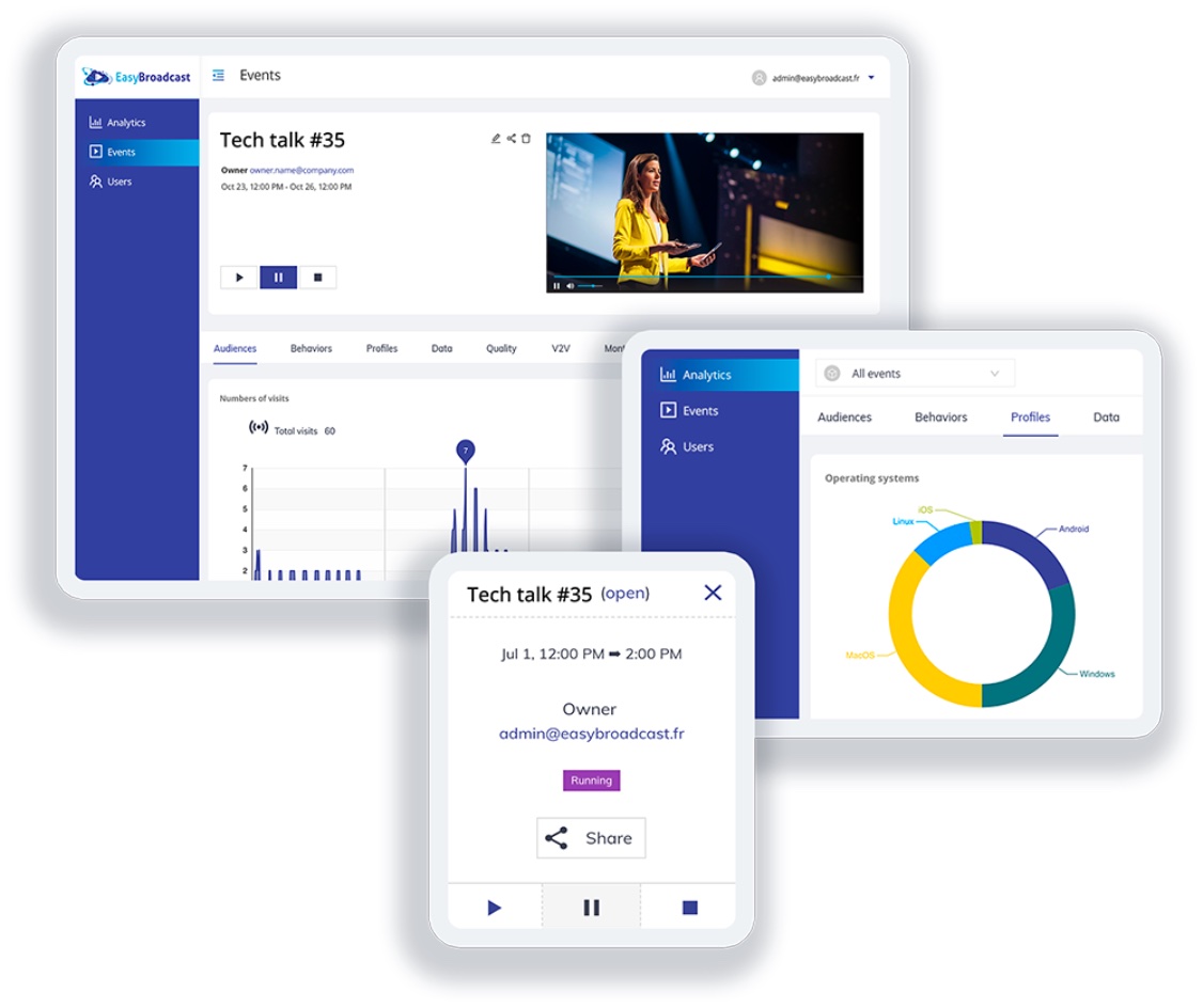 Simplify event management with EasyBroadcast. Have all your virtual events in one place, making it easy to manage, compare, and scale them. Whether it’s your team, content, speakers, or agenda, we have you covered. Webcast to your audience and track performance, per event or across the board.